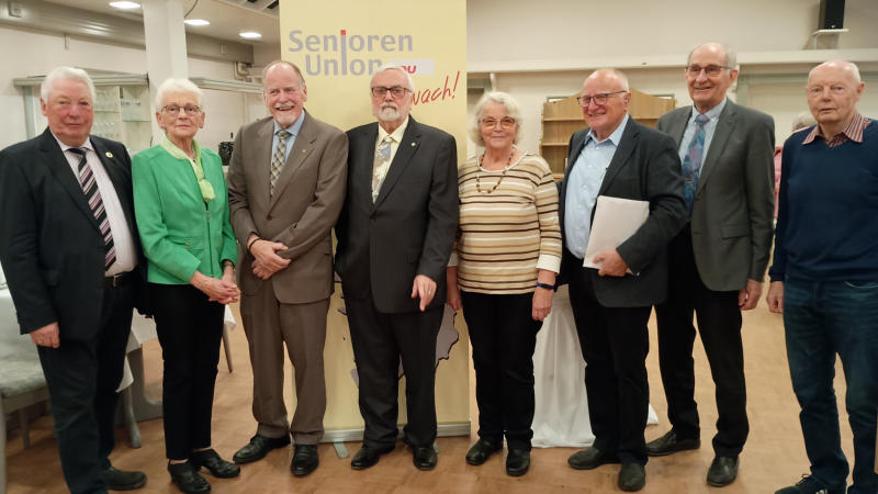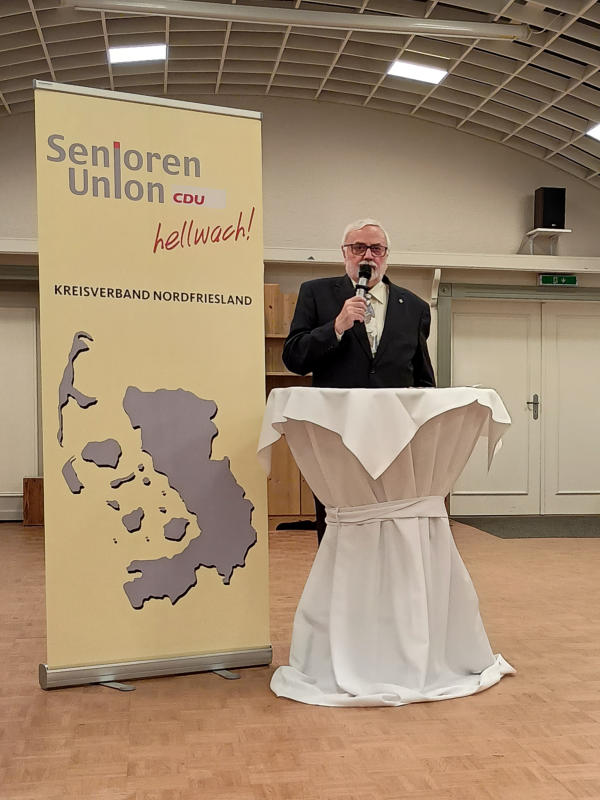 Kreis-Mitgliederversammlung am 03. November 2025Jürgen folgt auf JürgenSenioren-Union Nordfriesland bekommt neuen VorsitzendenEine denkwürdige Jahreshauptversammlung erlebten die Mitglieder der Senioren-Union (SU) des Kreises Nordfriesland in Paulsen’s Gasthof in Bohmstedt, denn der seit 14 Jahren amtierende Vorsitzende Jürgen Feddersen trat nicht mehr zur Wahl an. Aus Altersgründen hatte der Pellwormer bereits im August auf seine Wiederwahl als stellvertretender Bundesvorsitzender in Magdeburg verzichtet, und auch sein Amt als stellvertretender Landesvorsitzender hatte er Mitte Oktober in Neumünster abgegeben. Bereits dort wurde Jürgen Müller-Belzer als sein Nachfolger als Vertreter des Landesvorsitzenden Dieter Holst aus Eutin gewählt, bevor der Bredstedter Anfang November von 100 Prozent der anwesenden Mitgliedern das Vertrauen für die Führung der Kreisvereinigung der SU bekam. Weitermachen als Stellvertreter darf Peter Tetzlaff aus Tönning, der zusätzlich die Funktion des Mitgliederbeauftragten wahrnimmt. Ebenso wieder gewählt wurde Renate Harder aus Riesbriek als Schriftführerin. Der Schobüller Hans-Jörg Thauer übernahm das Amt des Schatzmeisters von Klaus Ehlers aus Niebüll, der ebenfalls aus Altersgründen nicht mehr antrat. In Beisitzerfunktion verbleiben Peter Christiansen (Leck), Carsten Harder (Riesbriek) und Hermann Weber (Bordelum), neu dazu gehört Karin Jessen (Niebüll).Vor den Wahlen, die wieder souverän von Hermann Weber als Tagungspräsident geleitet wurden, hatte Jürgen Feddersen letztmalig entsprechend der Tagesordnung Berichte und Ehrungen ausgesprochen. Peter Christiansen und Klaus Ehlers erhielten für besondere Verdienste die Ehrennadel der SU in Silber überreicht. Diese heftete der neue Vorsitzende auch Jürgen Feddersen an, der die Goldene Ehrennadel vom Landesvorsitzenden bereits bei der Landesdelegiertenversammlung überreicht bekommen hatte. Jürgen Müller-Belzer würdigte das 50-jährige politische Engagement von Jürgen Feddersen, das auf der Internetseite des SU Schleswig-Holstein nachzulesen ist. So war es nur folgerichtig, dass Jürgen Feddersen mit seinem Ausscheiden aus dem Amt an diesem Tag zum Ehrenvorsitzenden der Senioren-Union Nordfriesland ernannt wurde. Seiner Frau Renate, die die vergangenen Jahrzehnte ihrem Mann den Rücken für sein umfangreiches ehrenamtliches Engagement als Bürgermeister, Kreistagsabgeordneter, Amtsvorsteher, Landtagsabgeordneter, Kurdirektor, Kreisvorsitzender des S-H-Gemeindetages, Aktivitäten in Reederei, Wasserverband oder DRK sowie bei seinen Funktionen in CDU und SU frei gehalten hatte, wurde als kleines Dankeschön mit viel Applaus eine Orchidee überreicht. Bericht von Jürgen Müller-Belzer