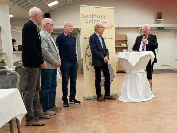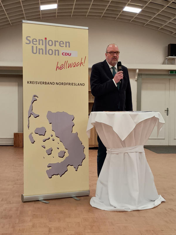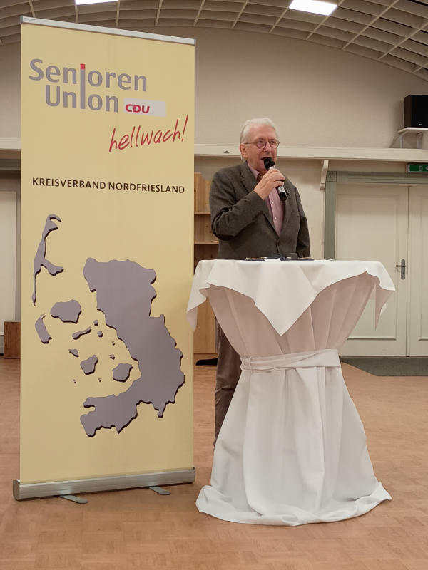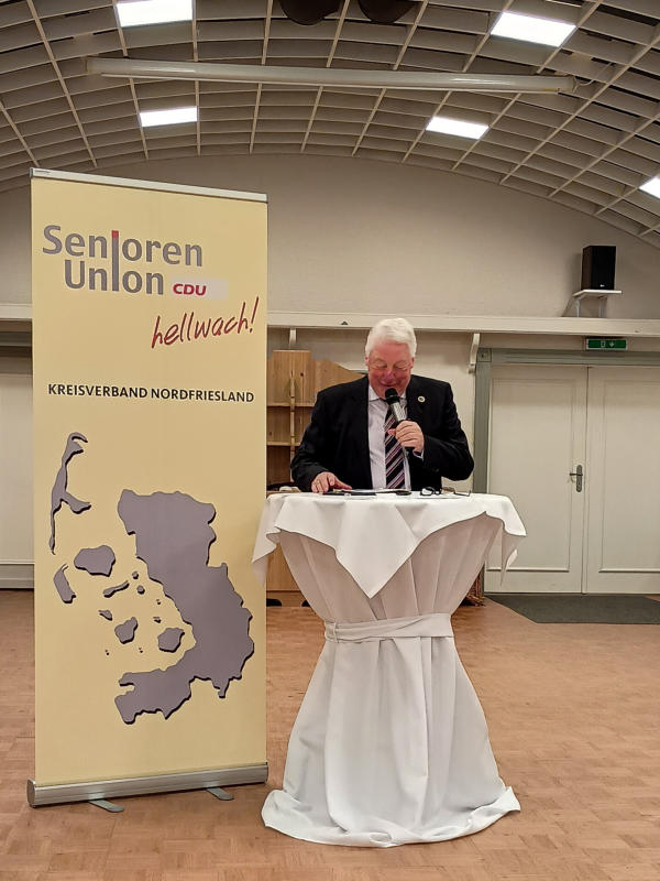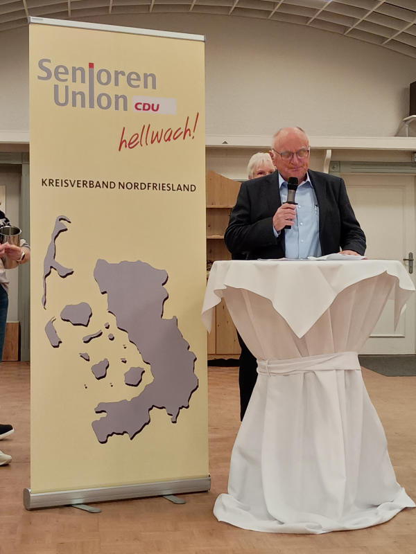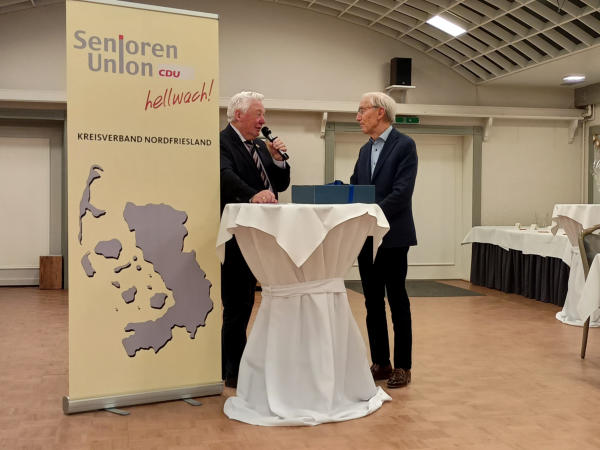 Kreis-Mitgliederversammlung am 03. November 2025Jürgen folgt auf JürgenSenioren-Union Nordfriesland bekommt neuen VorsitzendenEine denkwürdige Jahreshauptversammlung erlebten die Mitglieder der Senioren-Union (SU) des Kreises Nordfriesland in Paulsen’s Gasthof in Bohmstedt, denn der seit 14 Jahren amtierende Vorsitzende Jürgen Feddersen trat nicht mehr zur Wahl an. Aus Altersgründen hatte der Pellwormer bereits im August auf seine Wiederwahl als stellvertretender Bundesvorsitzender in Magdeburg verzichtet, und auch sein Amt als stellvertretender Landesvorsitzender hatte er Mitte Oktober in Neumünster abgegeben. Bereits dort wurde Jürgen Müller-Belzer als sein Nachfolger als Vertreter des Landesvorsitzenden Dieter Holst aus Eutin gewählt, bevor der Bredstedter Anfang November von 100 Prozent der anwesenden Mitgliedern das Vertrauen für die Führung der Kreisvereinigung der SU bekam. Weitermachen als Stellvertreter darf Peter Tetzlaff aus Tönning, der zusätzlich die Funktion des Mitgliederbeauftragten wahrnimmt. Ebenso wieder gewählt wurde Renate Harder aus Riesbriek als Schriftführerin. Der Schobüller Hans-Jörg Thauer übernahm das Amt des Schatzmeisters von Klaus Ehlers aus Niebüll, der ebenfalls aus Altersgründen nicht mehr antrat. In Beisitzerfunktion verbleiben Peter Christiansen (Leck), Carsten Harder (Riesbriek) und Hermann Weber (Bordelum), neu dazu gehört Karin Jessen (Niebüll).Vor den Wahlen, die wieder souverän von Hermann Weber als Tagungspräsident geleitet wurden, hatte Jürgen Feddersen letztmalig entsprechend der Tagesordnung Berichte und Ehrungen ausgesprochen. Peter Christiansen und Klaus Ehlers erhielten für besondere Verdienste die Ehrennadel der SU in Silber überreicht. Diese heftete der neue Vorsitzende auch Jürgen Feddersen an, der die Goldene Ehrennadel vom Landesvorsitzenden bereits bei der Landesdelegiertenversammlung überreicht bekommen hatte. Jürgen Müller-Belzer würdigte das 50-jährige politische Engagement von Jürgen Feddersen, das auf der Internetseite des SU Schleswig-Holstein nachzulesen ist. So war es nur folgerichtig, dass Jürgen Feddersen mit seinem Ausscheiden aus dem Amt an diesem Tag zum Ehrenvorsitzenden der Senioren-Union Nordfriesland ernannt wurde. Seiner Frau Renate, die die vergangenen Jahrzehnte ihrem Mann den Rücken für sein umfangreiches ehrenamtliches Engagement als Bürgermeister, Kreistagsabgeordneter, Amtsvorsteher, Landtagsabgeordneter, Kurdirektor, Kreisvorsitzender des S-H-Gemeindetages, Aktivitäten in Reederei, Wasserverband oder DRK sowie bei seinen Funktionen in CDU und SU frei gehalten hatte, wurde als kleines Dankeschön mit viel Applaus eine Orchidee überreicht. Bericht von Jürgen Müller-Belzer